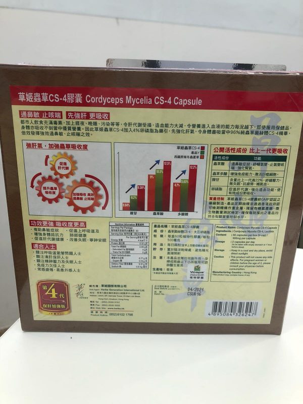 草姬蟲草第4代CS-4,意思係加入4%「卵磷脂」,一來加強保肝元素 ,二來可以提升吸收度,使其餘96%的蟲草CS-4的功效發揮得淋漓盡致,比其他蟲草更為身體吸收,倍效提升通鼻敏、止咳喘之效。