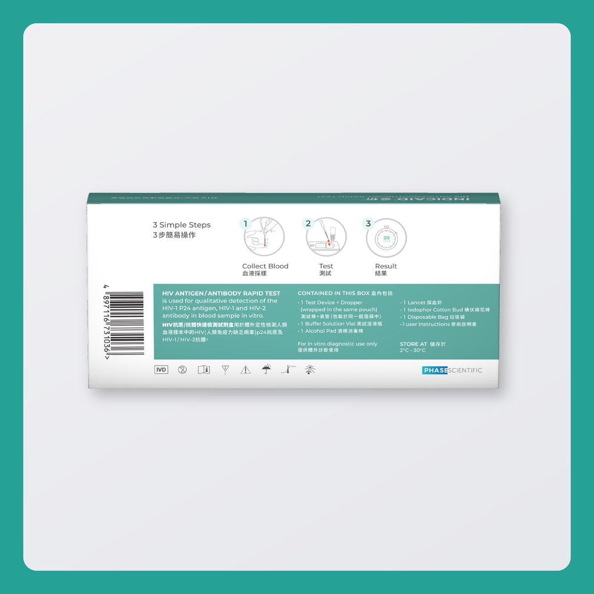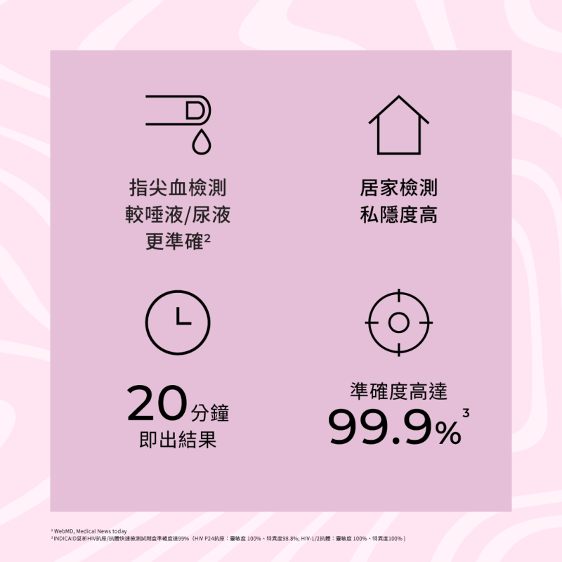 HIV(人類免疫力缺乏病毒)有機會引發愛滋病,但早期驗出就能盡快治療。 INDICAID™妥析™HIV抗原/抗體快速測試採用最新一代HIV檢測技術,最早2週同時檢測HIV抗原和抗體,能更早一步發現HIV感染,從而更早獲得適當的支援及治療。