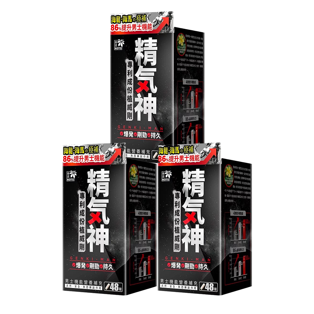 「精氣神」主要成份為海馬和海龍及多種漢方精製而成大補丸,特別加入外國註冊專利成份植威剛(透納葉萃取)增強男士機能。在古代海馬已經被視為天然的壯陽藥,成為炙手可熱的中藥材。 歷代皇帝都愛以海馬來補充能量,就好似唐玄宗經常會飲「海馬酒」以其精進身體;海龍亦稱為管口魚,跟海馬是親戚,性味功用與海馬相同,惟力量較強。功效溫腎壯陽,提高精液質量,增強精子活力用於陽痿遺精,《本草綱目拾遺》記載海龍功效同海馬而倍之, 這兩個主要成份互相輝映,達到最好功效。